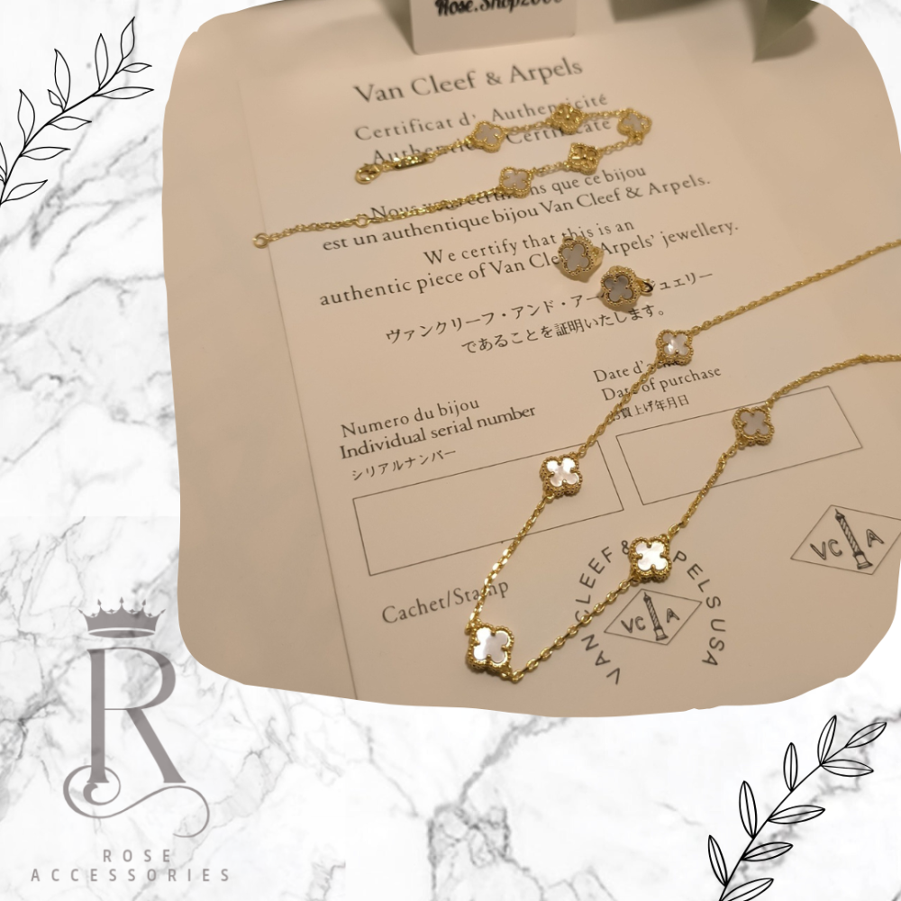 طقم فان كليف ٣ قطع وردة صغيرة سلسال ٥ وردات وحلق واسورة ٥ ورداتمطلي ذهب وعليه ختم البراند ضمان سنتين عاللون